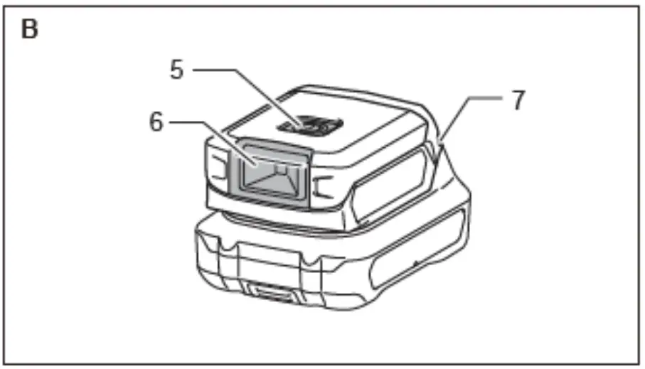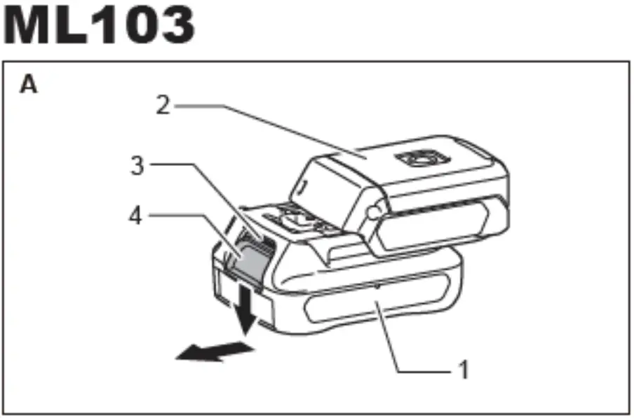 If you can see the red indicator (3) on the upper side of the button (4), it is not locked completely. Install it fully until the red indicator cannot be seen. If not, it may accidentally fall out of the luminaire, causing injury to you or someone around you. To remove the battery cartridge, slide it from the fuminaire while sliding the button on the front of the cartridge.