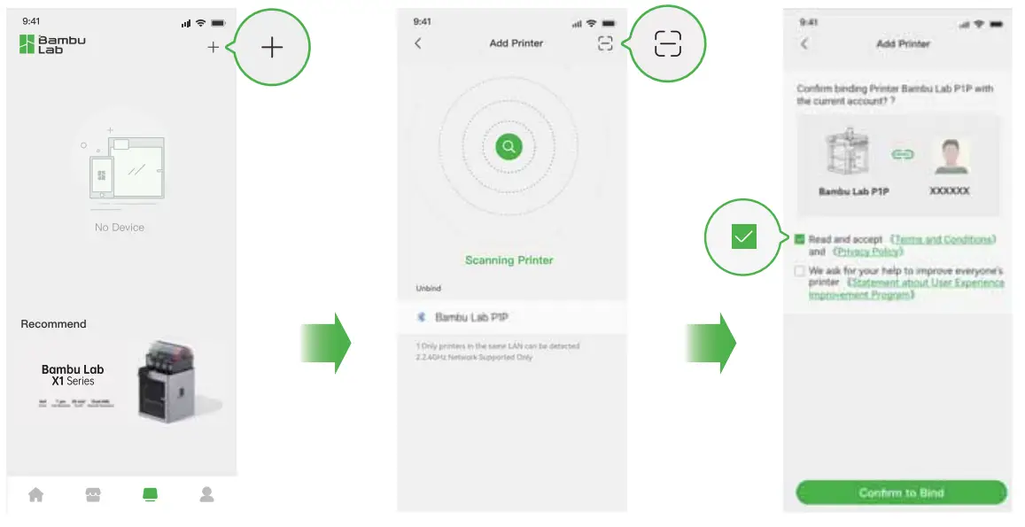 - Use Bambu Handy to scan the QR code on the screen, and bind your printer with your Bambu Lab account.