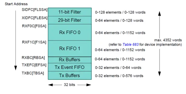 CAN filter logic allows you to configure the filters in various way. For example, the messages that pass the acceptance filtering can be stored in Rx FIFO (0 or 1) or in dedicated rx buffers. Each filter can be configured as an acceptance or rejection filter and can also be enabled or disabled. For acceptance filter, each filter list is performed from item #0 to the first matching item in the filter list. Before using filters it is mandatory to configure the starting address and the numbers of the filter to reserve part of message RAM. The figure below shows a view of the shared memory map and the registers (hence the starting addresses for each section).