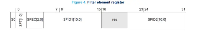 - FLESA = 0x04: the offset in words respect to message RAM base address. This because in previous configured filters area it has been reserved 0x04 words for standard ID filters and then the minimum usable offset is 0x04.