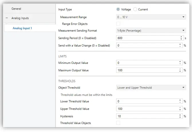 Range Error Objects [Disabled / Enabled]: enables one or two error objects (“[AIx] Lower Range Error” and/or “[AIx] Upper Range Error”) that notify an out-of-range value by periodically sending the value “1”. Once the value is within the configured range, a “0” will be sent through these objects.