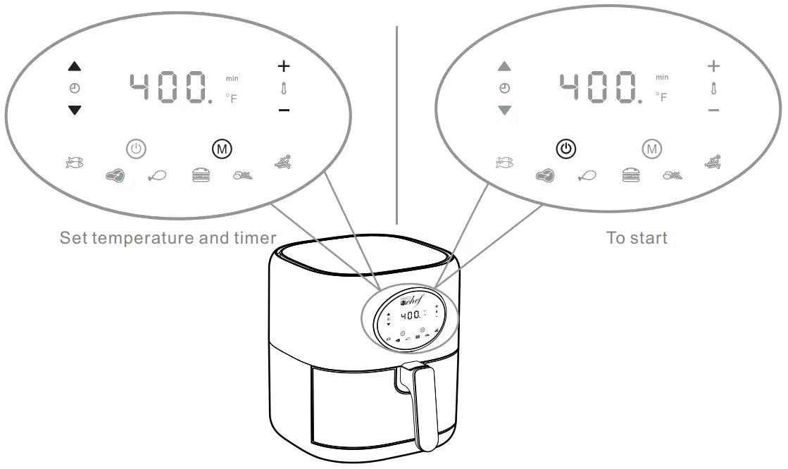 | Timer/mode is not set | Set timer/mode and press ON/OFF to start the air fryer | |