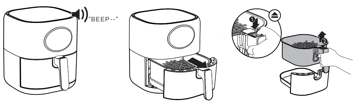 - When the time is up on the timer, the air fryer will beep and automatically turn off.