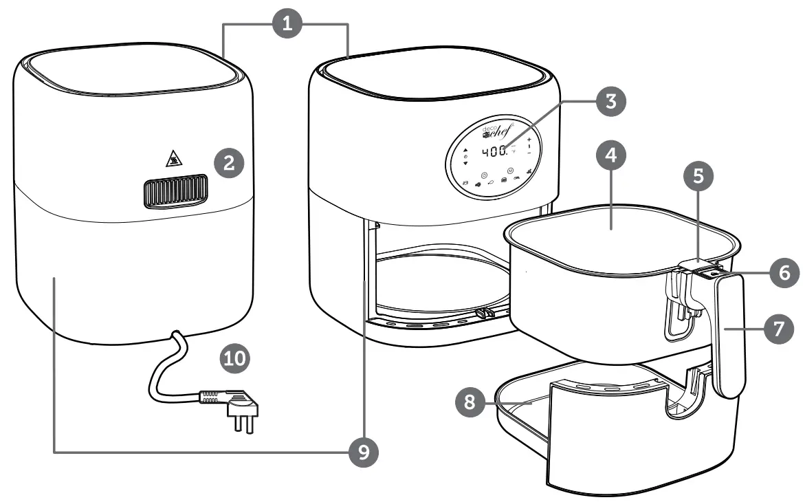 - Remove all packaging from the air fryer, including any temporary stickers.