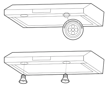 From the bottom of the hood, carefully insert the mounting screws (AA) with washers into each of the pre-drilled mounting holes in the range hood. Start with the front left, then front right. After the screws are in place for the front mounting holes, work on the rear left, then rear right. If you feel that you need to install the range hood more securely, you can use the additional two mounting screw holes in the front/center.