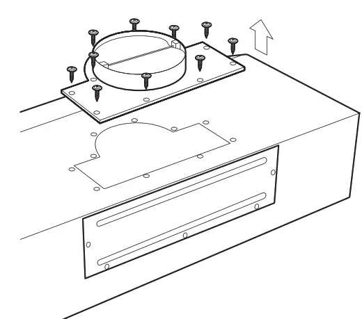 Remove the baffle filter from the hood by pushing the filter knob inward. Slowly pull the filter down and remove gently from the range hood. Then, remove the bottom cover by carefully unscrewing the eight screws as shown.