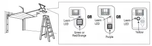 The “Learn” button on your garage door opener is located above the antenna wire that hangs from the motorhead, it may also be under a light cover. The “Learn” button will be either green, red/orange, purple or yellow.
