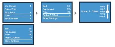 - Select Level Bed and select Proble Z Offset to adjust the first layer print height.