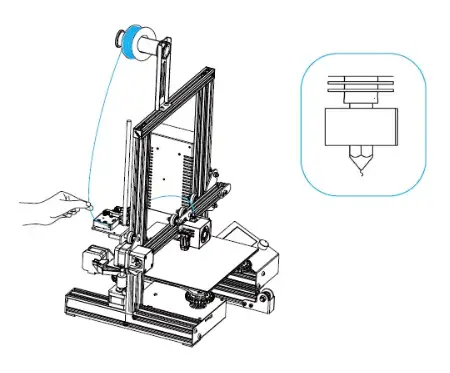 B. Press the filament until it passes through the filament detection hole. Then press and hold the extruder handle to insert the filament into Teflon tube until it reaches the nozzle.
