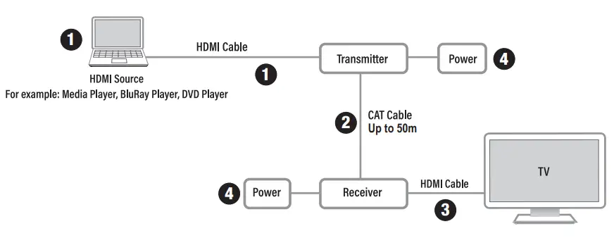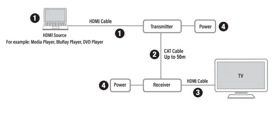 - Connect the HDMI input source to the transmitter unit using a HDMI cable