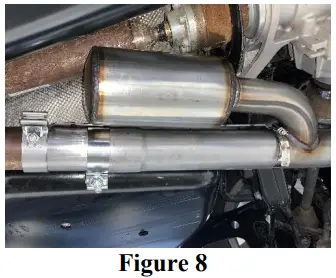 - Slide a 2.5 Clamp onto the Y-Pipe and slide onto the already installed adaptor then into the Passenger-Side Tail Pipe and the Drivers-Side Tail Pipe. Refer to Figure 7.