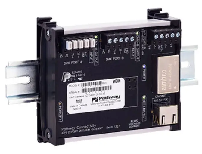The PWREP DIN P3 RDMHUB DMX/RDM Merger allows merging and switching between two DMX sources in a one-universe system.