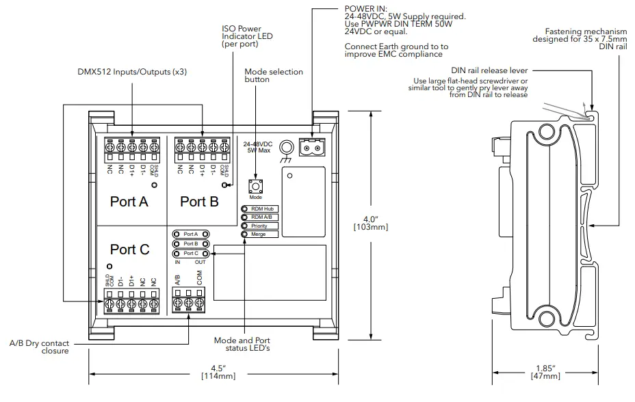 The PWREP DIN P3 RDMHUB will operate on a range of voltages from 24-48 volts DC, with a maximum power consumption of 5 Watts. Observe the correct polarity when connecting V+ and V-. The earth ground terminal must be connected to the enclosure’s chassis or electrical ground terminal to improve EMC compliance.