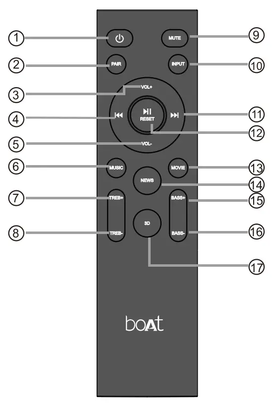 - The remote control includes BT mode playback controls
