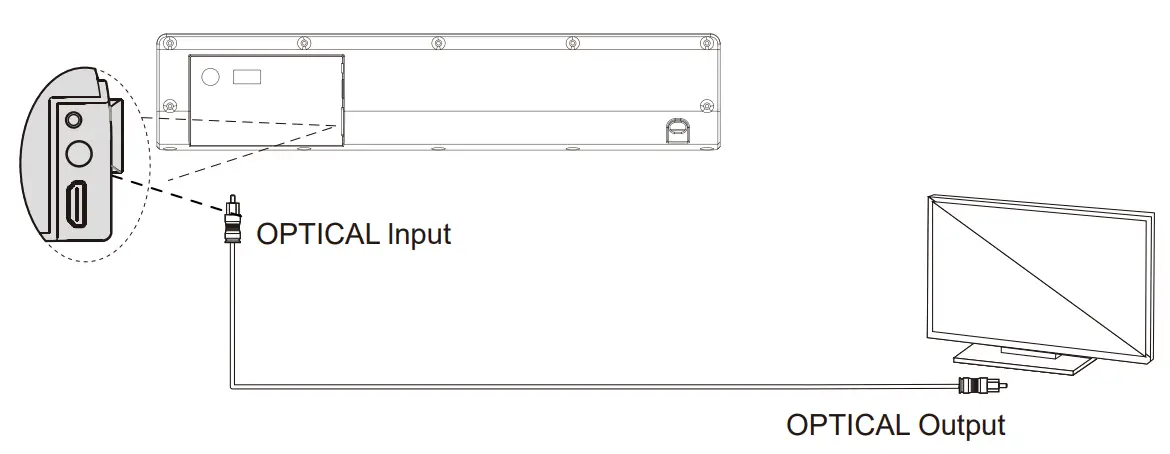 | There is no sound from sound bar (OPTICAL Mode) | OPTICAL cable might be damaged and no signal is received by the soundbar due to a failed connection and incorrect operation mode selected. |