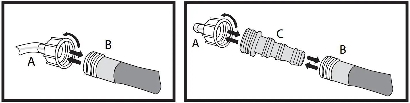 - If an adaptor is provided (vary with models), thread the adaptor (C) to the sprayer connector (A) and insert the garden hose (B) into the adaptor (C).