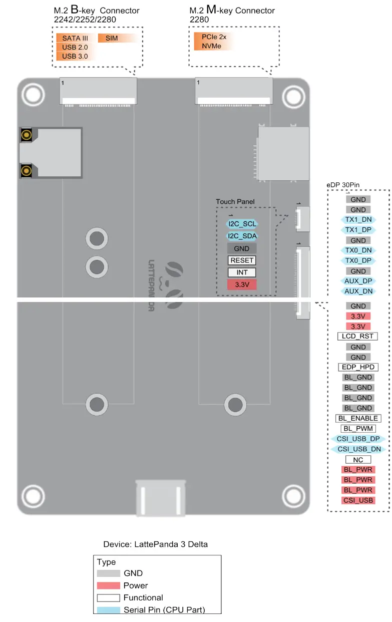 There are two M.2 sockets on the LattePanda 3 Delta. Key M(2280): Support M.2 NVMe SSD Key B(2242/2252/2280): Support M.2 4G / 5G Module, M.2 SATA SSD