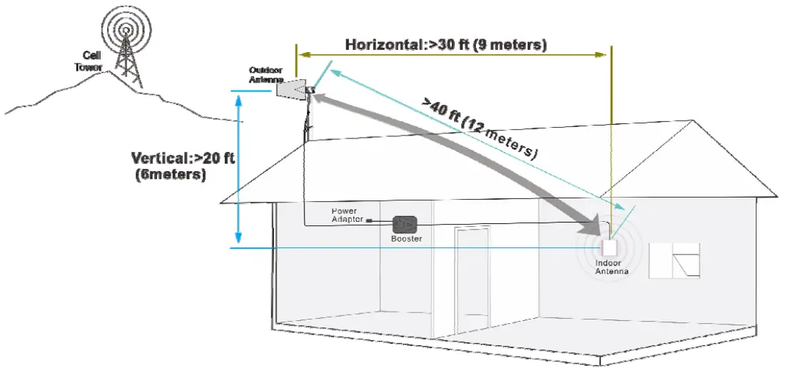 - Keep enough distance between the inside and outside antenna, Minimum Required Separation Distance Between Inside and Outside Antenna: Straight line distance over 40 feet(12 meters) or 30 feet (9 meters) horizontal distance 20 feet (6 meters) vertical distance (as far as possible).