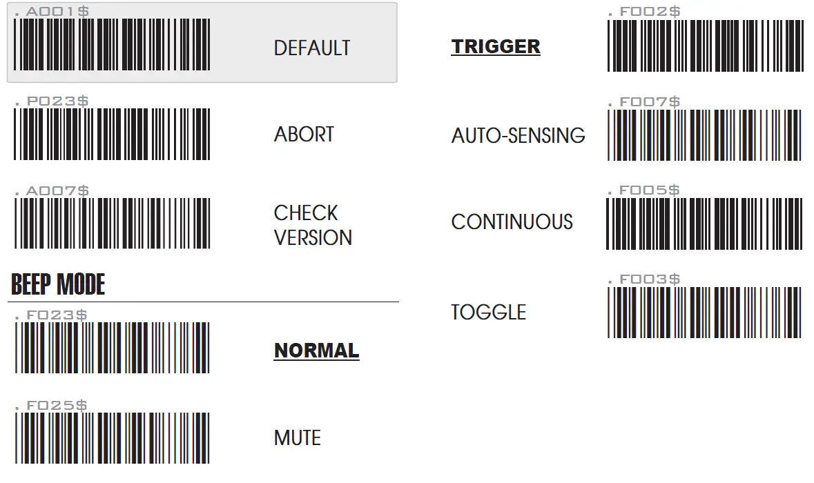 - Single short beep The scanner reads a Code39 of ASCII in the configuration procedure