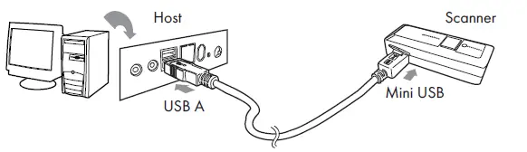 - Insert the mini USB connector into the port on the scanner and USB A connector into a USB port on the host PC