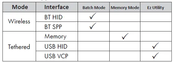 - BT HID – Emulates a Bluetooth HID keyboard that transmits each barcode data to the host after decode. (See page 9)