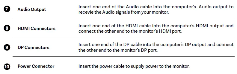 Connect the signal line to output interfaces signal of DP/HDMI signals of PC, and then connect the other end of the signal line to the corresponding signal input port of the display.