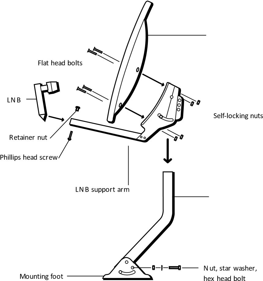 - Begin Dish Assembly – Attach the reflector to the support arm so that you can preset the correct elevation.