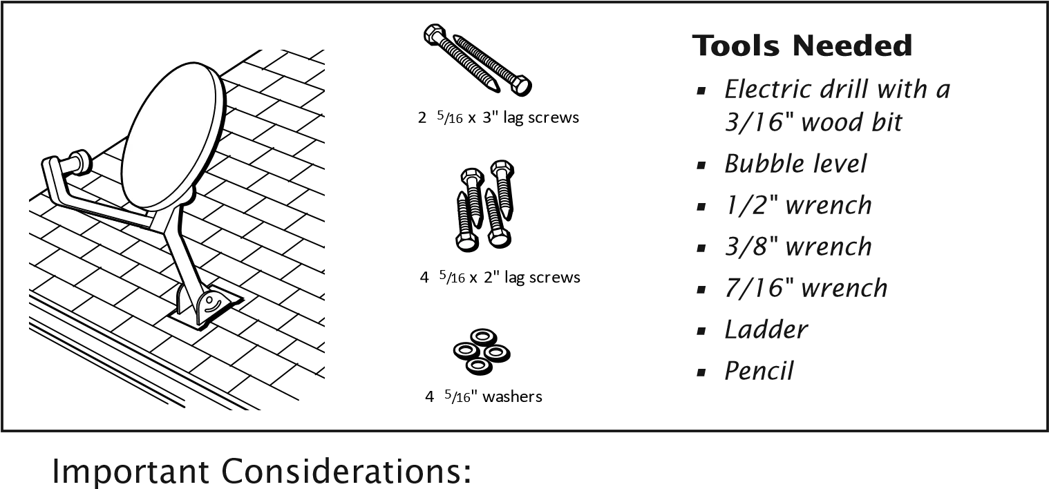 When following the instructions in this guide to install and connect the satellite antenna and connections, take extreme care to avoid contact with overhead power lines, lights and power circuits. Contact with power lines, lights, and power circuits may be fatal.