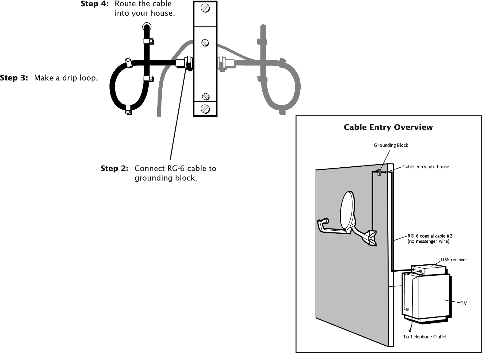 The outdoor dish antenna used to receive satellite signals and the cable used to connect the outdoor dish antenna to the indoor receiving unit are required to comply with local installation codes and the appropriate sections of the National Electrical Code (NEC), especially Articles 250, 810 and 820. These codes require proper grounding of the metal structure of the outdoor dish antenna and grounding of the connecting cable at a point where it enters the house (or other building). If you are having a professional installer make the installation, the installer must observe installation codes in making the installation. The DSS® System Self-Installer’s Kit contains instructions on how to make the installation in compliance with the National Electrical Code (NEC). If additional local installation codes apply, contact local inspection authorities.
