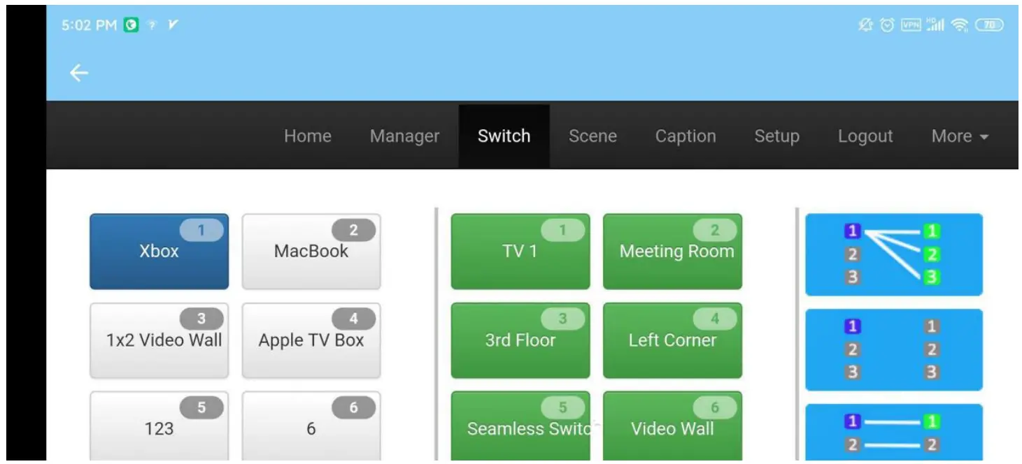 This Manager interface, it allows the users to manage at most 254 units of the matrices which are installed at the same area network and at the same gateway but different IP addresses. As below are showing 3 matrices, users can rename each matrix and click button to do the switching or open in a new manage window.