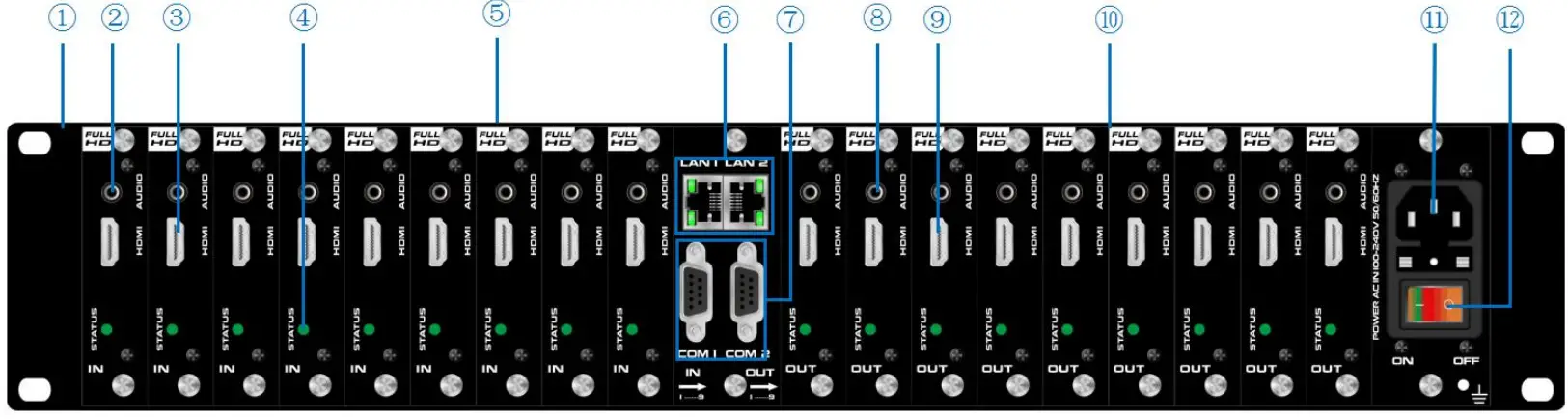 ⑩ | Input slots | Supports DVI/HDMI/VGA/CVBS/YPbPr/FIBER/HDBaseT output |