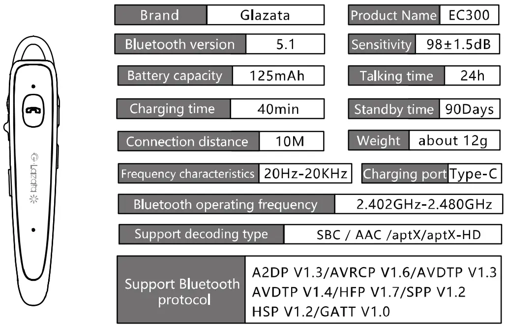 Glazata EC300 Voice Wireless Headset Set User Manual