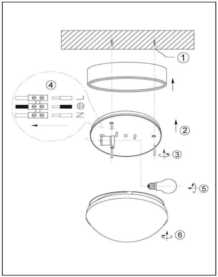 Please pay attention to locations where the item can be installed (indoor, outdoor, bathroom (for outdoor and bathroom installation, please see further). Indoor items cannot be used in humid places. Do not put the item in contact with water or any liquids or inflammable products. Always respect the minimal distance (indicated on the light) to inflammable products.