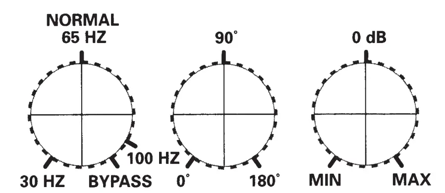 This controls the crossover frequency between 30 Hz and 1 00 Hz. If it is set to 30 Hz for example, the subwoofer will reproduce those frequencies below 30 Hz. Rotating the control clockwise will smoothly increase this frequency range up to 100 Hz. In the bypass position, the crossover control has no effect. You should set this to bypass if your processor has its own subwoofer crossover frequency control. If your processor does not have its own subwoofer crossover frequency control, rotate this control until the bass sounds natural. If the mid-bass sounds natural but you want more low bass, turn the crossover frequency down a little, then turn the volume up by about the same amount. This increases the low-bass output while leaving the mid-bass output the same - Phase
