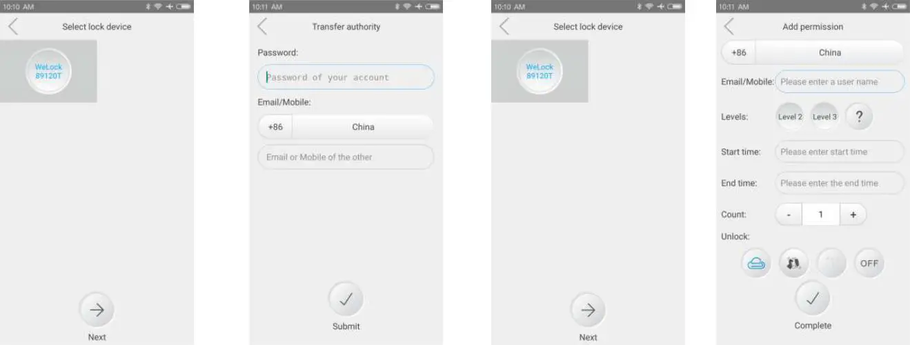 to select the lock name ,Click “Next” to input the phone number, you want to authorize; Click “Next” and enter user’s account phone number,