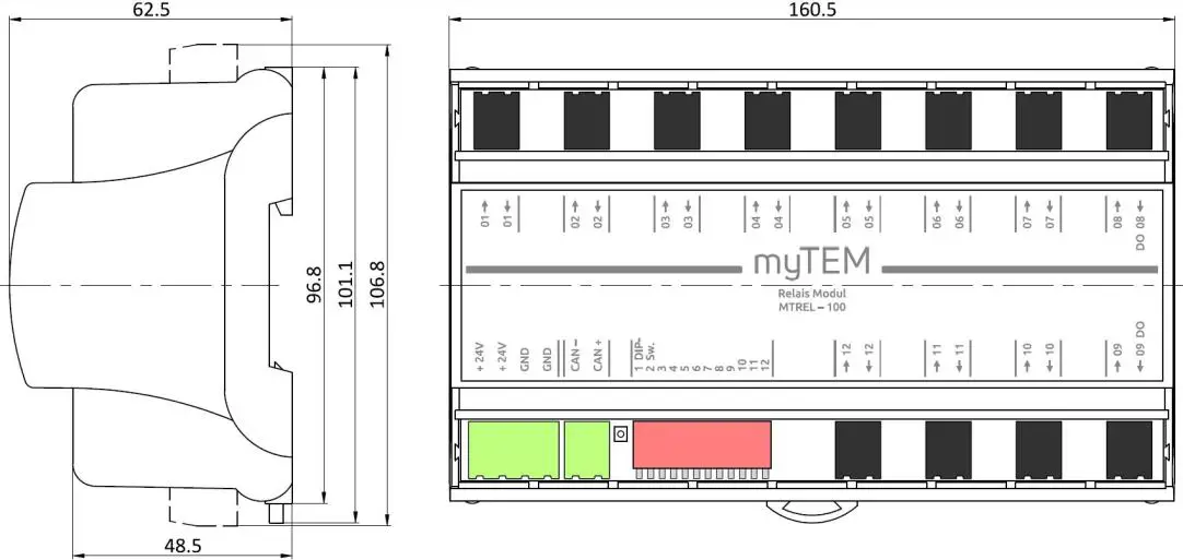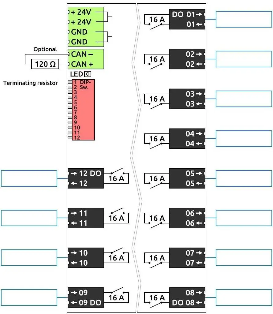 - Supply voltage 24 VDC ± 10% with support terminals for further wiring CAN bus 12 digital outputs with potential-free relays 16 A, 250 VAC or 30 VDC (DO1 DO12) Manual positions of the outputs via DIP switch for easy commissioning The device is installed in a control cabinet, mounted on a 35 mm DIN rail