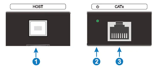 | 3 | CATx | RJ45 connector for a CAT5e/6/7 Ethernet cable to connect the transmitter and the receiver. |