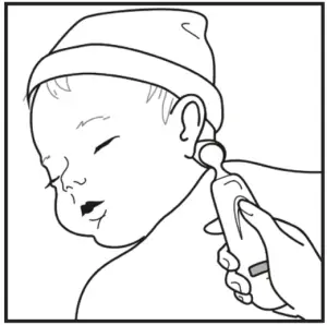 | Step 1 Slide across the forehead. Place probe flush on the center of the forehead and depress the button. eeping button depressed slowly slide probe mid-line across the forehead to the hair line. | Step 2 Slide behind the ear. Keeping button depressed, lift probe from the forehead, touch behind ear halfway down the mastoid process and slide down to the soft depression behind the earlobe. | Step 3 Release button, remove from heat, and read. |