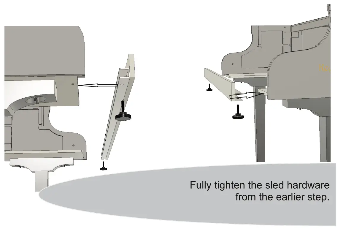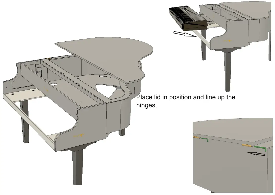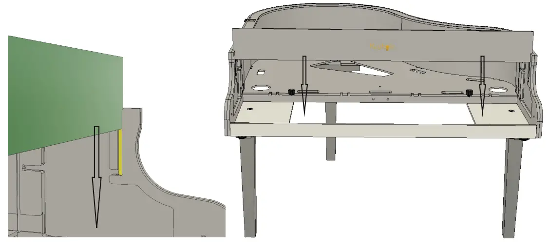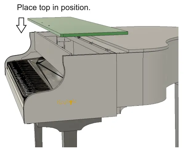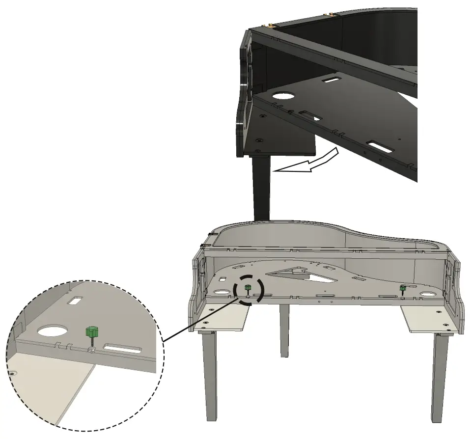 Begin with the main body of the piano upside down. Attach the legs using the leg hardware.