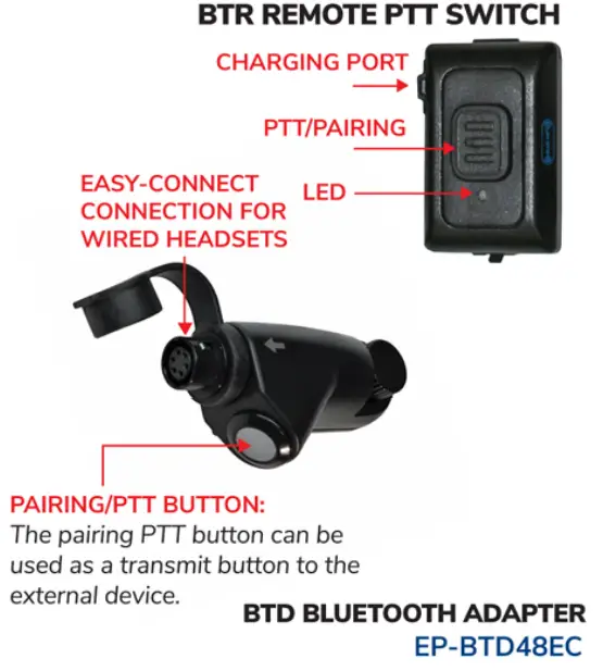 - Pairing BTR Bluetooth Remote Switch to Bluetooth Radio Adapter (BTD). With radio off, hold down the PTT button on the radio adapter making sure not to completely cover the LED. While holding down, turn on the radio at the same time until LED is flashing Blue/Red then release. Short press again then release. The LED will flash slow Blue/Red.Now the radio adapter is in pairing state. Next. press & hold the PTT button on the remote switch until LED is flashing Blue/Red then release. When LED on the radio adapter turns blue. pairing is complete. Now power up earbuds. Wait about 15 seconds for everything to link up. Now you are ready to transmit.