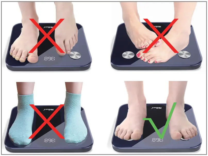 - Place the body fat scale on a flat ground during the measurement and stand barefoot on the body fat scale. ( Please do not wear socks to stand on the scale if you want get the accurate and full analysis of your body