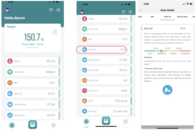 - After the measurement is completed, t he body data is displayed on the app.