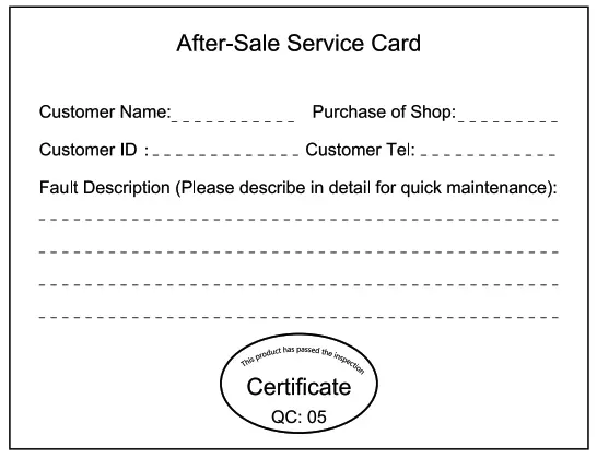 (3) Damage that caused by external force and other natural disasters. - Please fill this card and contact your distributor when products have quality problem