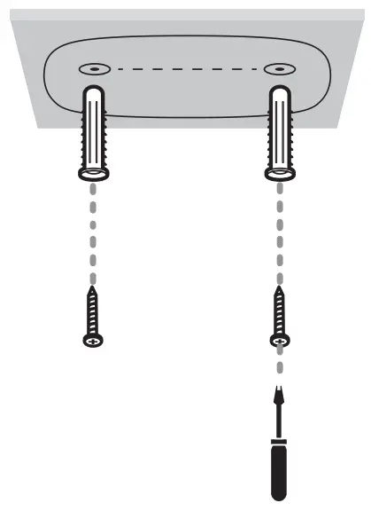 Affix two mounting screws with the help of mounting template. For wall mounting, insert two anchors into holes and screw the screws into the anchors.