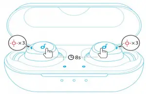 - Press and hold the button on both earbuds for 8 seconds until the earbud LED indicators flash red for 3 times.