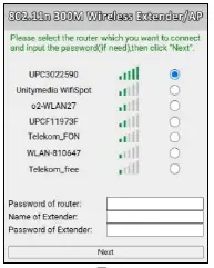 - After entering the setting page, just select your home wifi router and input your home wifi router password (change ssid and password of extender if need), then click “Next”.