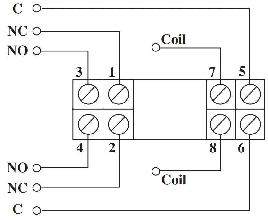 - Relay will activate upon applying 12VDC to the terminals marked [7] and [8].
