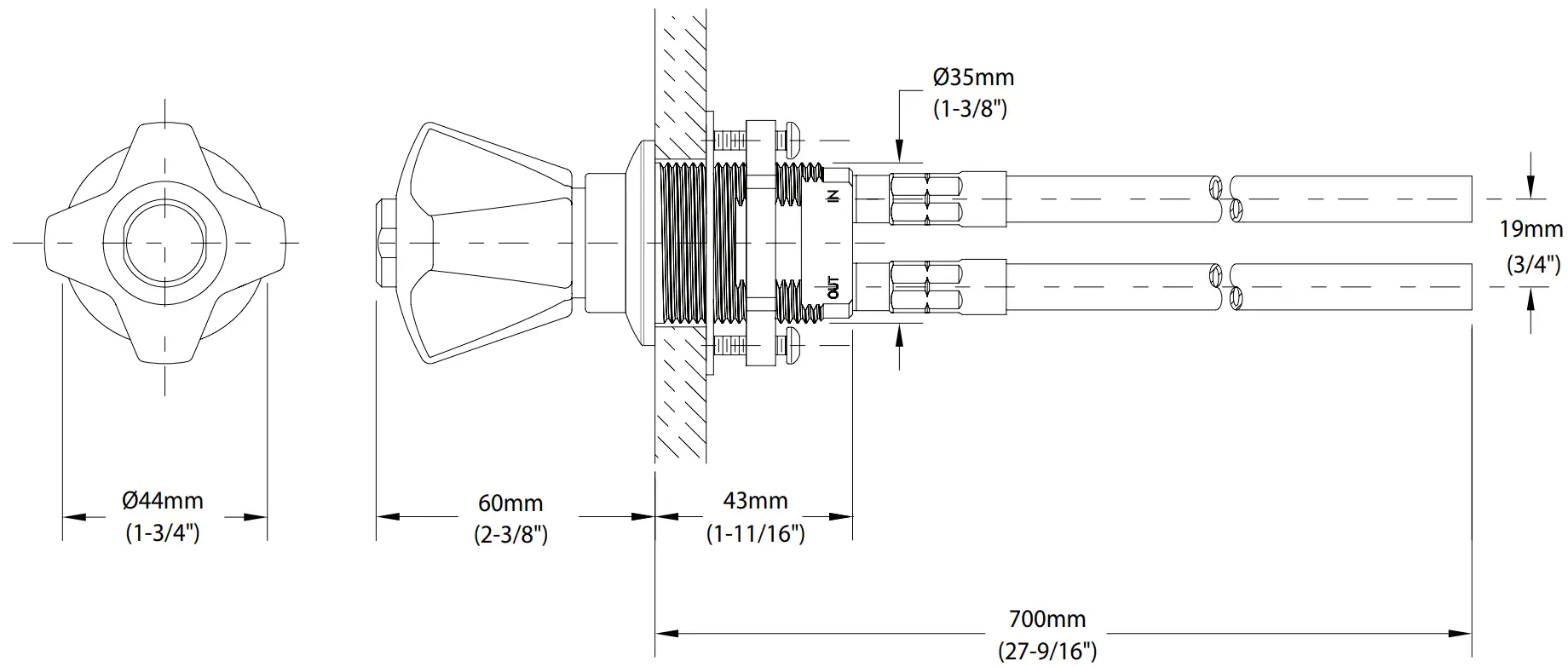 Provide a 36mm (1-7/16″) diameter hole. Maximum panel thickness is 25mm (1”). All working components of valve are accessible from front exterior face of cupboard.