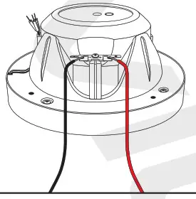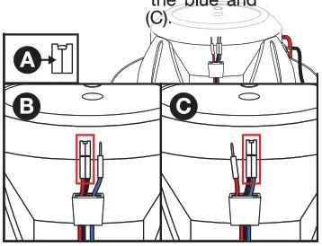 Connect the speaker wires. (-), the right terminal is Positive (+).![]() | Change the speaker’s LED color by using the included jumper (A) to connect the red and black wires for red (B) or the blue and black wires for blue (C). |
