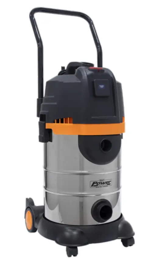 High powered industrial unit features cyclonic technology. Bagless design prevents loss of suction improving efficiency. Outlet produces clean air suitable for use as a blower. Features safety shut-off for wet operation. Includes a strong, comfortable handle, hose brackets, accessory storage base, durable stainless steel tank, liquid drainage device and an ‘auto power take off’ socket. Supplied with 3.8m cable.